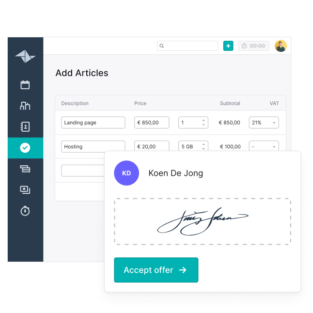 With our quotation program you send quotations and get notified when your customer opens, gives feedback or signs them. Smart filters let you view open, won or lost sales opportunities and track them easily.